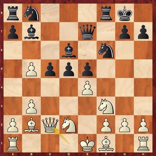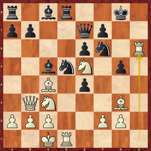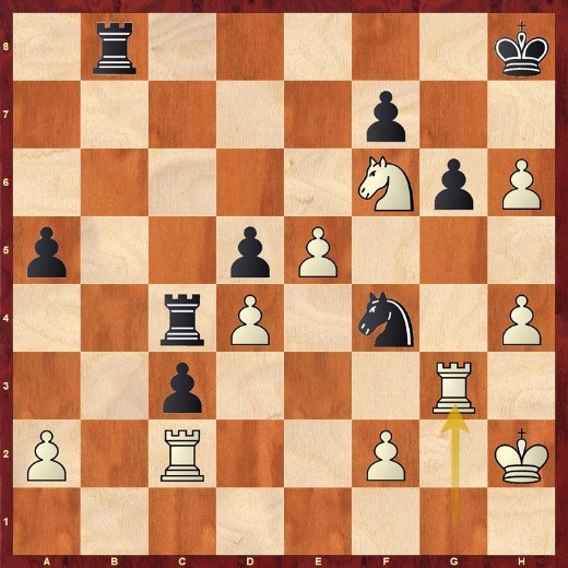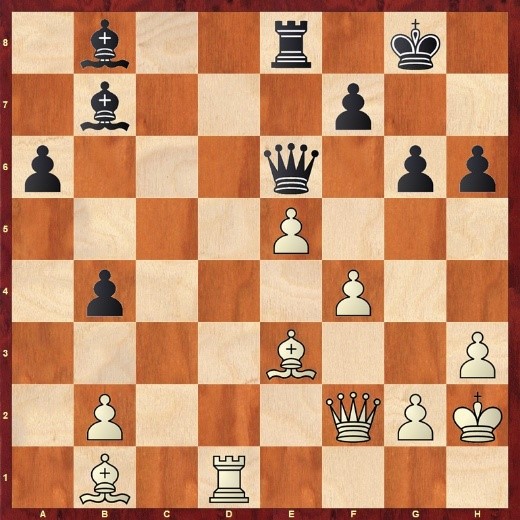 Nach zuletzt 19.…f7-f5 folgte 20.exf5, und hier opferte Schwarz überraschend mit Lxg2!? eine Figur. Es folgte 21.Kxg2 Dc6+ 22.Kf1 Sf3 23.Txf3? (besser war Dd1 und Stockfish schätzt die Stellung gleich ein) Dxf3 24.Df2 Dxh3+ 25.Kg1 Dg4+ 26.Kf1 Dh3+ und man einigte sich auf remis wegen Dauerschach. Dabei wäre es nach 26….h3 wohl noch schlimmer für Weiß gekommen.