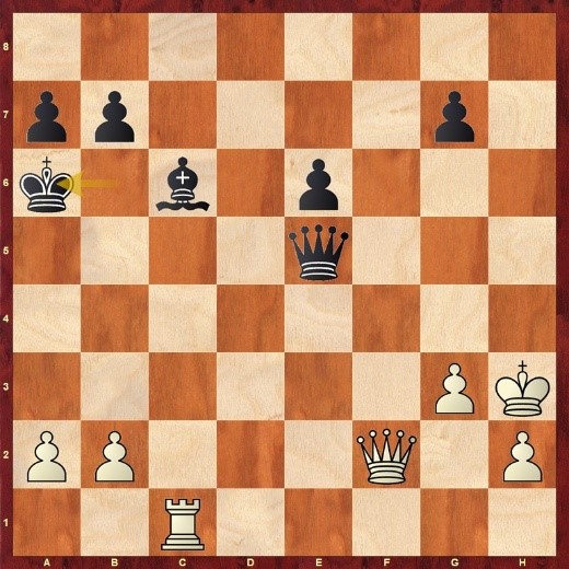 Hier zog Arne, der inzwischen nur noch seine 30 Sekunden Bonus hatte, 31.Df4 (am einfachsten hätte laut Stockfish 31.Tc5 gewonnen, aber die Varianten sind bei der Bedenkzeit nicht einfach zu berechnen). Jetzt hätte Schwarz mit Dh5+ 32.Dh4 Df5+ 33.g4 Dd3+ 34.Dg3 Dh7+ Dauerschach geben können. Aber Schwarz zog 31….Dxb2? 32.Dc4+ Kb6 und Arne gab auf c5 und c4 Dauerschach. Bei mehr Zeit hätte er vielleicht 33.Tc3 gespielt, z.B. Dg2+ 34.Kg4 und die Engine sieht eine klare Gewinnstellung für Weiß.